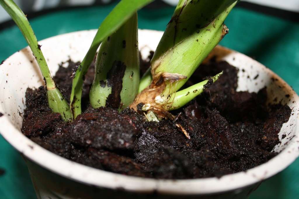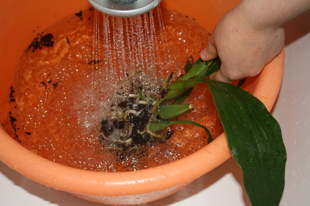 Время от времени грязную воду желательно сливать и помогать себе душем, направляя струю воды на корневище. Струю воды нужно отрегулировать таким образом, чтобы она не навредила своей силой корням, и тем не менее была достаточно сильной, чтобы вымывать субстрат из корневища.
