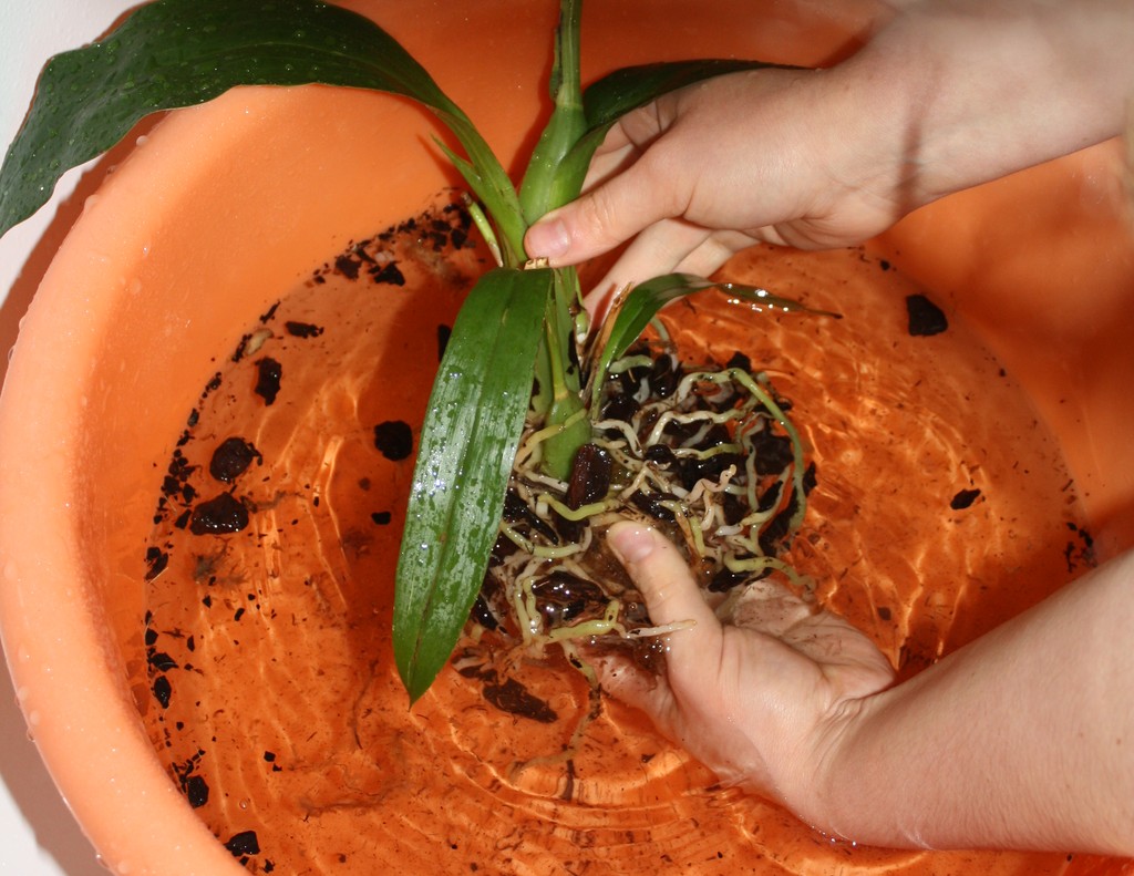 Лучший способ стрясти кору с корней и более менее распутать их — расшевелить их пальцами. Производить данную процедуру лучше всего в воде. Одной рукой держите орхидею за псевдобульбы, а другой как бы расталкиваете сплетённые корни в разные стороны.
