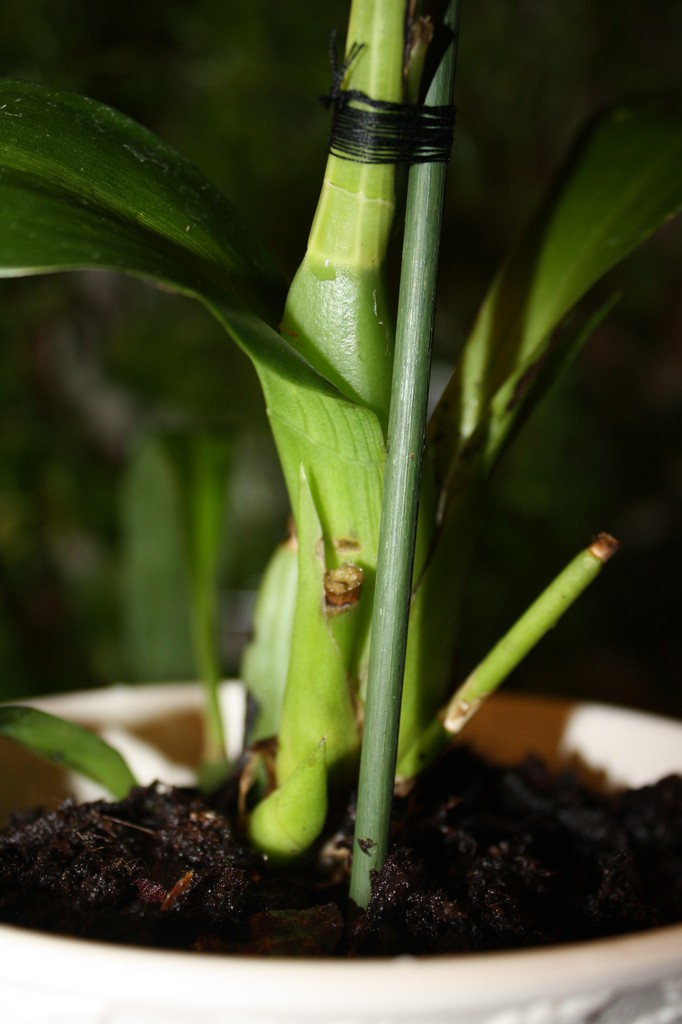 Для того чтобы окончательно ЗАКРЕПИТЬ РАСТЕНИЕ В ГОРШКЕ, нужно воткнуть рядом с псевдобульбами палочки и подвязать их к ним. Со временем, когда растение самостоятельно закрепиться корнями в субстрате, подпорки можно будет убрать.