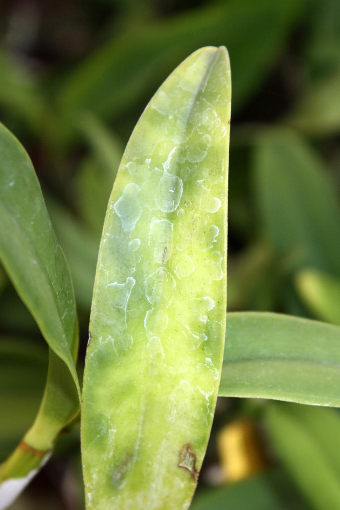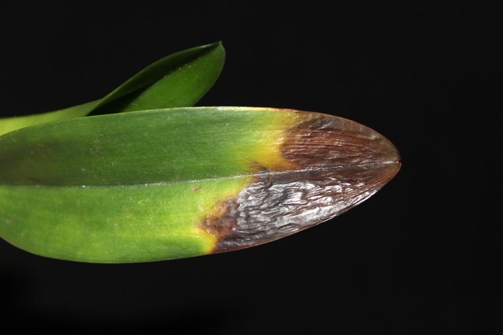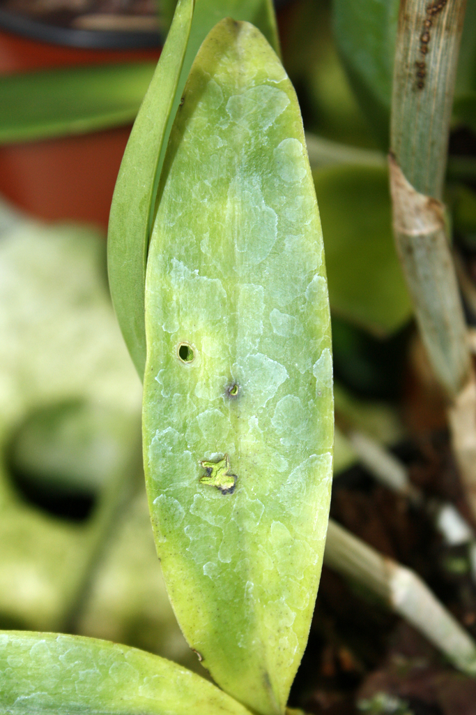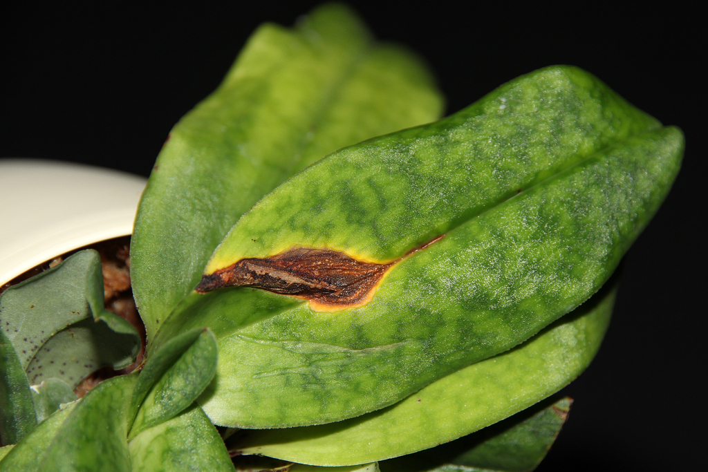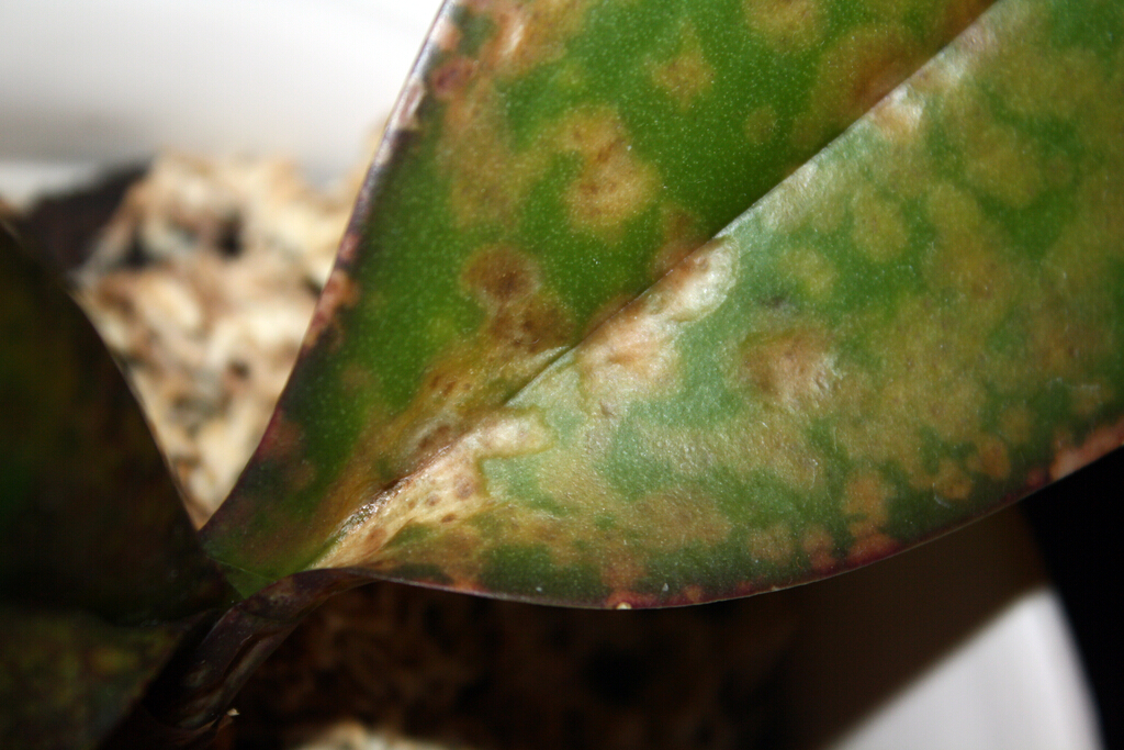 Повреждение вызывает струя горячего воздуха от батареи, особенно в опасности находятся растения, листья которых свисают над батареей. На некоторых видах (сортах) Phalaenopsis (определённая структура листа) схожее повреждение появляется от солнца, т.е. СОЛНЕЧНЫЙ ОЖОГ.