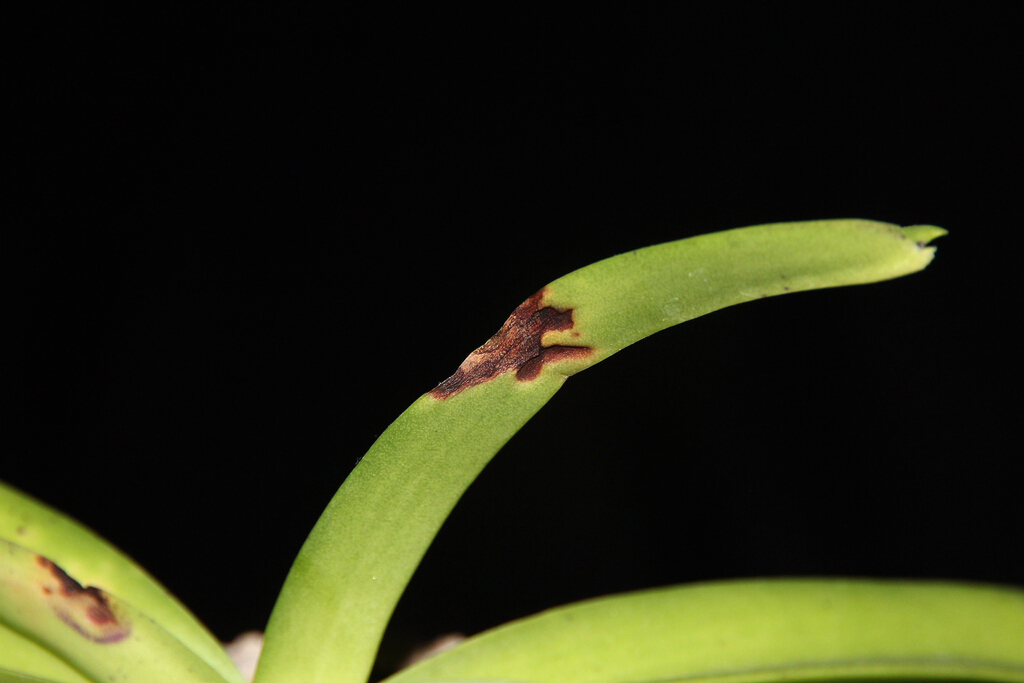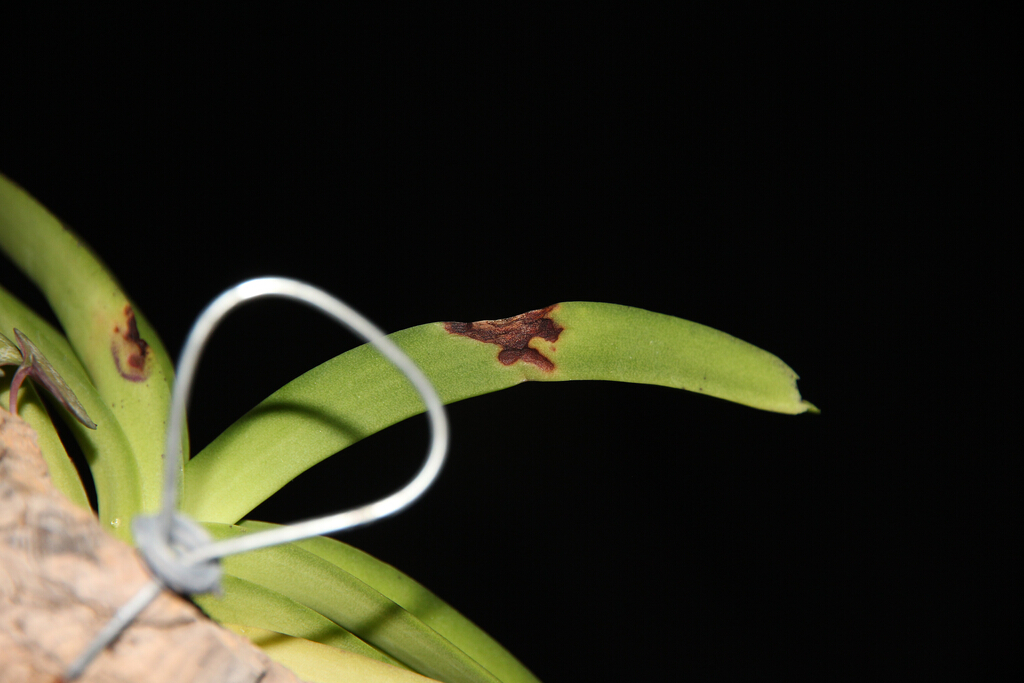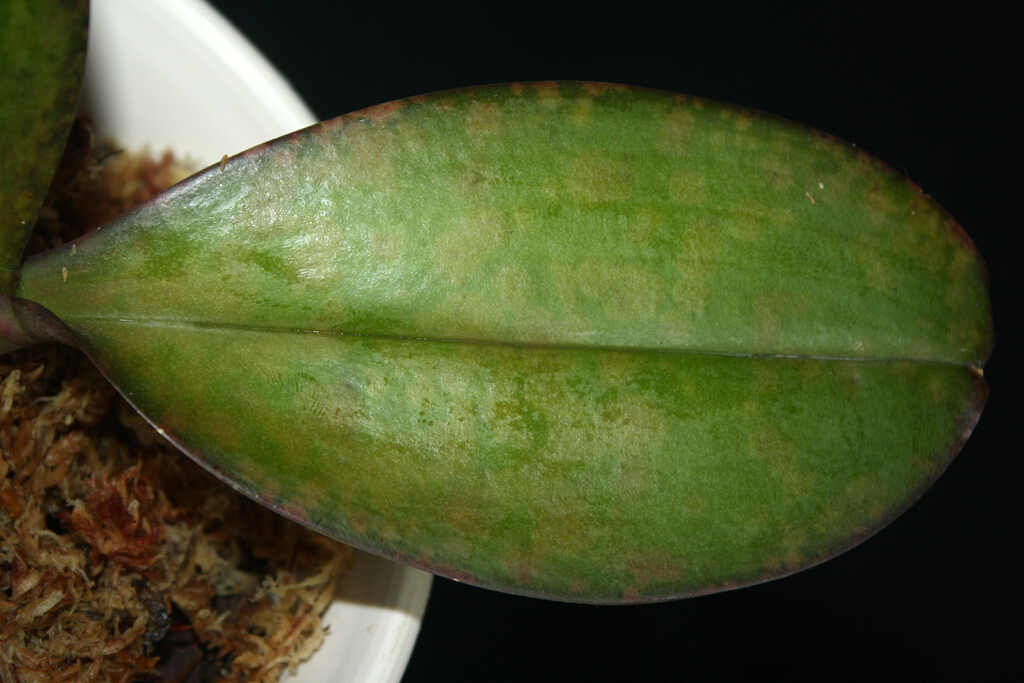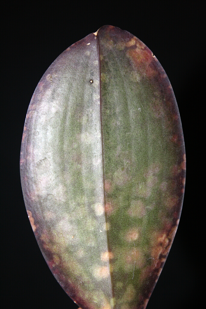 Dendrobium: На листьях появляются СВЕТЛЫЕ КОЛЬЦА, ДВОЙНЫЕ РОМБЫ или ОВАЛЫ, ткани достаточно долго не вдавливаются. Просто так на глаз вы ни за что не отличите вирус от грибковой инфекции, пока не пройдёт какое-то время. Если инфекция грибная, рано или поздно на поверхности пятен появятся споры, конидии и т.п. При вирусах их не будет! Процессу можно поспособствовать, убавив свет и повысив влажность воздуха. Однако, не редко случается, что на поверхности вызванных вирусом пятен (колец) поселяются грибы, меняя цвет тканей на чёрный, тогда наружу рано или поздно выйдут их споры.