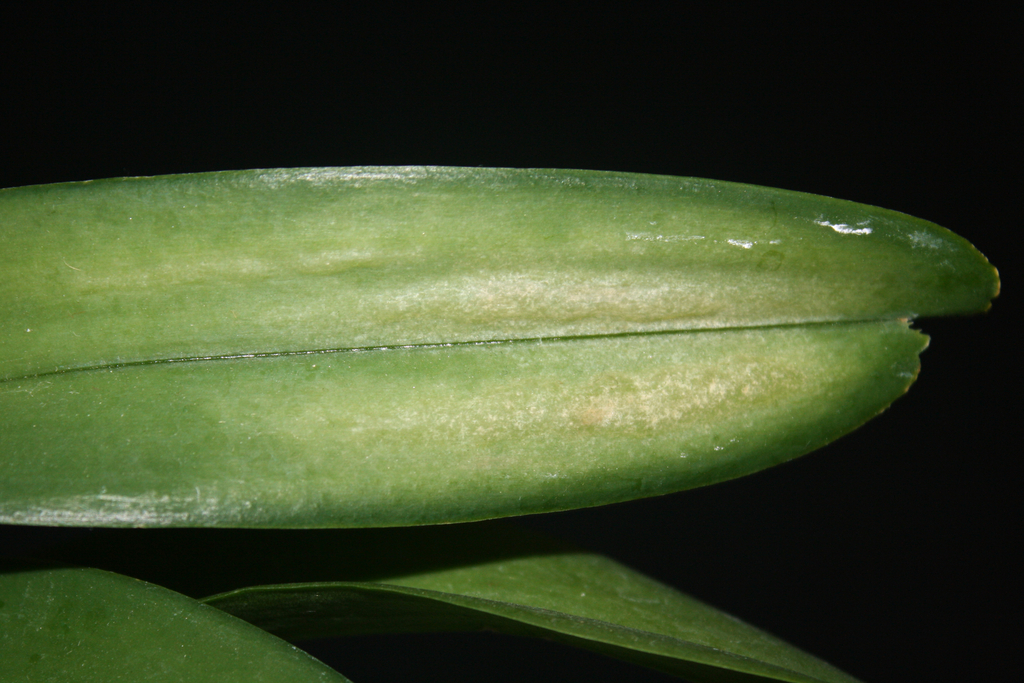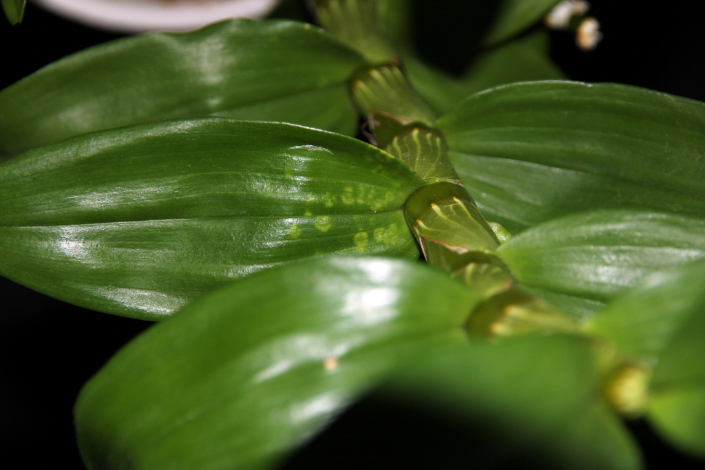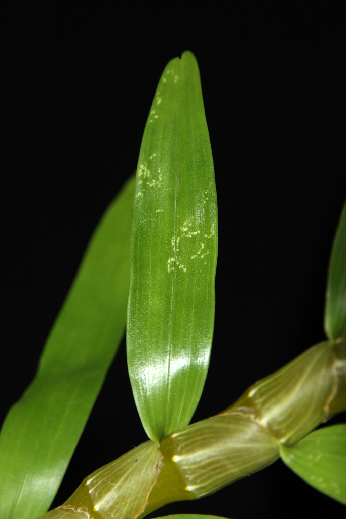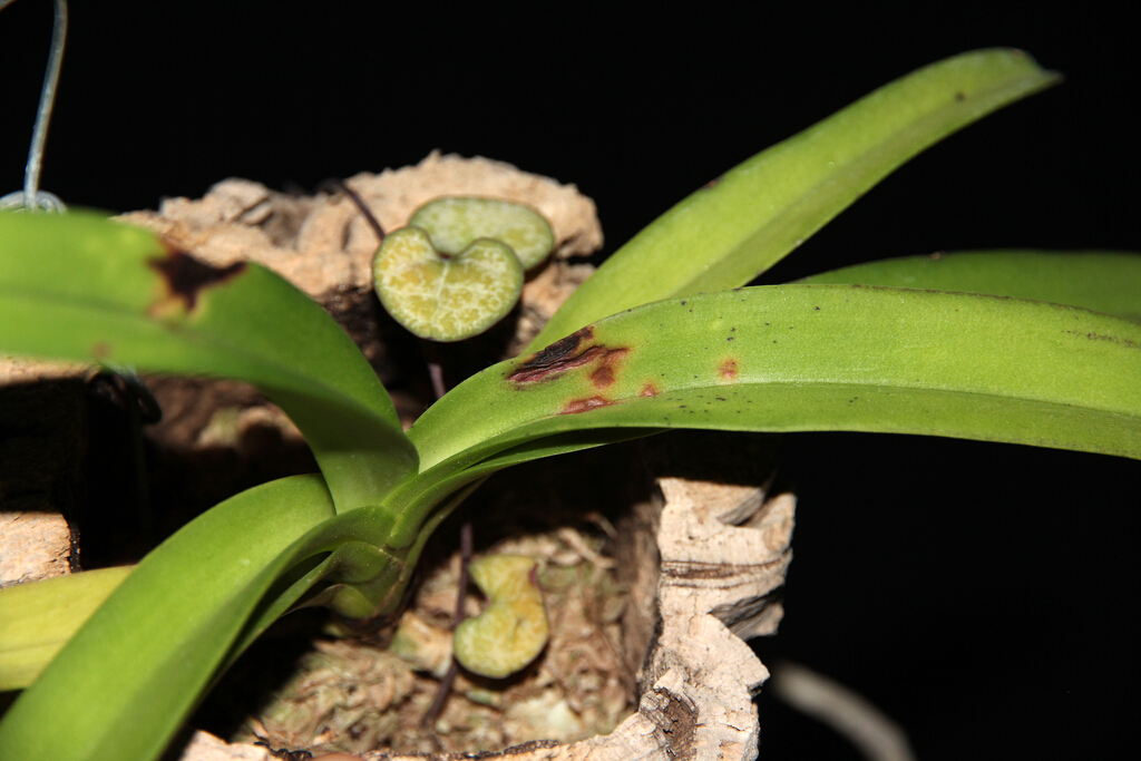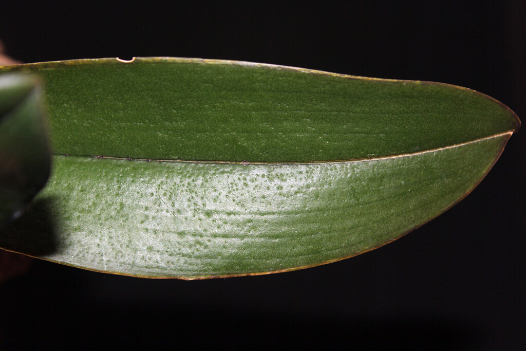 Dendrobium: На листьях появляются СВЕТЛЫЕ КОЛЬЦА, ДВОЙНЫЕ РОМБЫ или ОВАЛЫ, ткани достаточно долго не вдавливаются. Просто так на глаз вы ни за что не отличите вирус от грибковой инфекции, пока не пройдёт какое-то время. Если инфекция грибная, рано или поздно на поверхности пятен появятся споры, конидии и т.п. При вирусах их не будет! Процессу можно поспособствовать, убавив свет и повысив влажность воздуха. Однако, не редко случается, что на поверхности вызванных вирусом пятен (колец) поселяются грибы, меняя цвет тканей на чёрный, тогда наружу рано или поздно выйдут их споры.