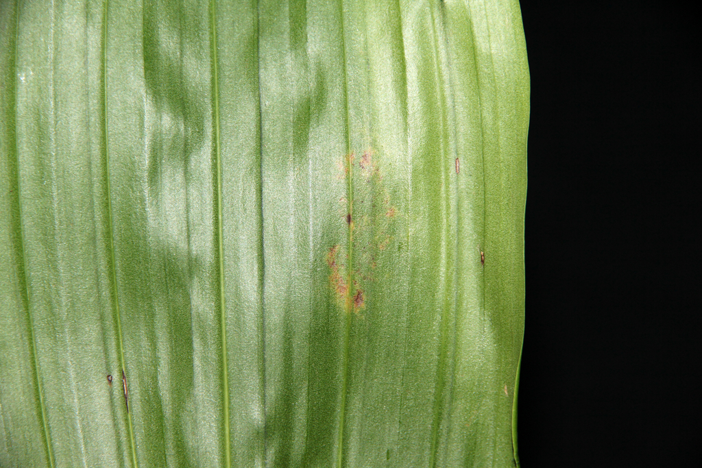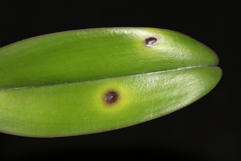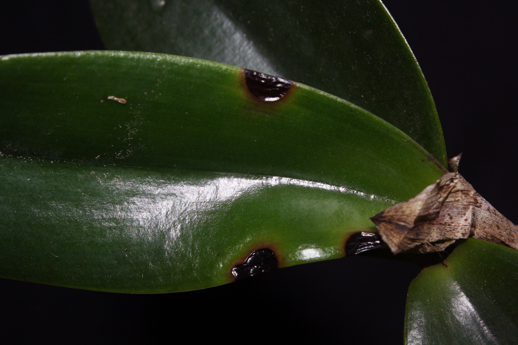 На орхидеях встречается очень часто и на первый взгляд почти ничем не отличается от бактериального поражения. Самое большое отличие, пожалуй — пожелтение мокрого пятна и листа в целом. Однако, структура листьев у орхидей разная, поэтому данное правило действует не всегда.